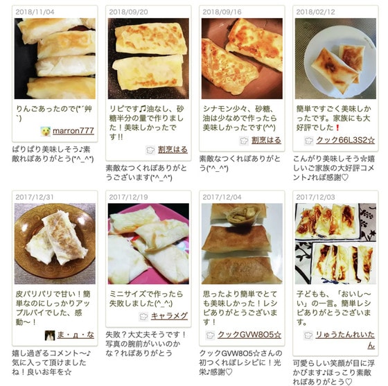 つくれぽ(つくりましたフォトレポートのこと)には、「とにかく簡単で感動!」「お手軽なのにしっかりアップルパイでした」「外サクサク、中はとろ〜りがたまりません!」などなど、喜びのコメントが届いています。