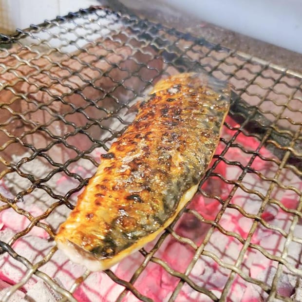 注文してしばらくすると、カウンター越しに設置された炭火焼き台から、美味しそうに焼かれていく塩サバの食欲を刺激する香りと煙が立ち上り、店内に充満していきます。