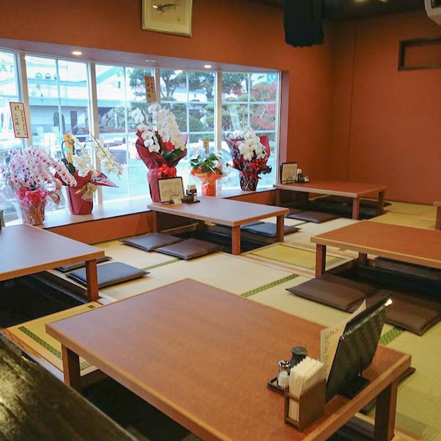 窓の外の景色が開放的な広々としたお座敷は、足元が楽な掘りごたつ式となっており、友人や家族とゆったりくつろぎながら食事を楽しめる、心安らぐ空間が広がっていました。