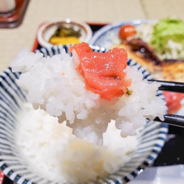 炭火焼きの焼きサバとお刺身だけですでにご飯が足りないほどですが、穂波定食には何ともう一つの福岡県民のソウルフードである明太子までついています。