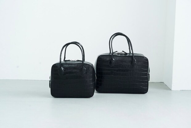 スムースレザータイプの他に、クロコ調レザーもあります。左からCROCO BOX BOSTON[W20×H15.5×D9cm]¥82,500、[W26×H19×D10cm]¥93,500(共にMAISON CANAU)