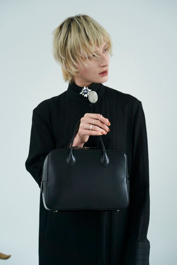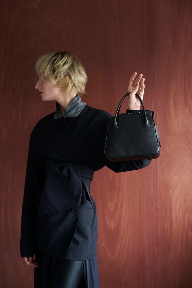 続いてご紹介したいのは、ラウンドボストンタイプです。繊細なシボが美しいシュリンクレザーを使用していて、前出のボストンよりもぐっとエレガントな印象です。通勤にはもちろんですが、写真のMサイズは特にお子さんの卒入園式や卒入学式などにもオススメ。ちょうど学校行事用のバッグをお探しのお母さま方も多くいらっしゃる季節だと思いますが、こちらであればどこに持って行っても恥ずかしくなく、表から見える位置にブランドロゴなど入っていない点も最適かなと思いますよ。実は筆者も来年の娘の卒入学式用に検討中です(笑)。