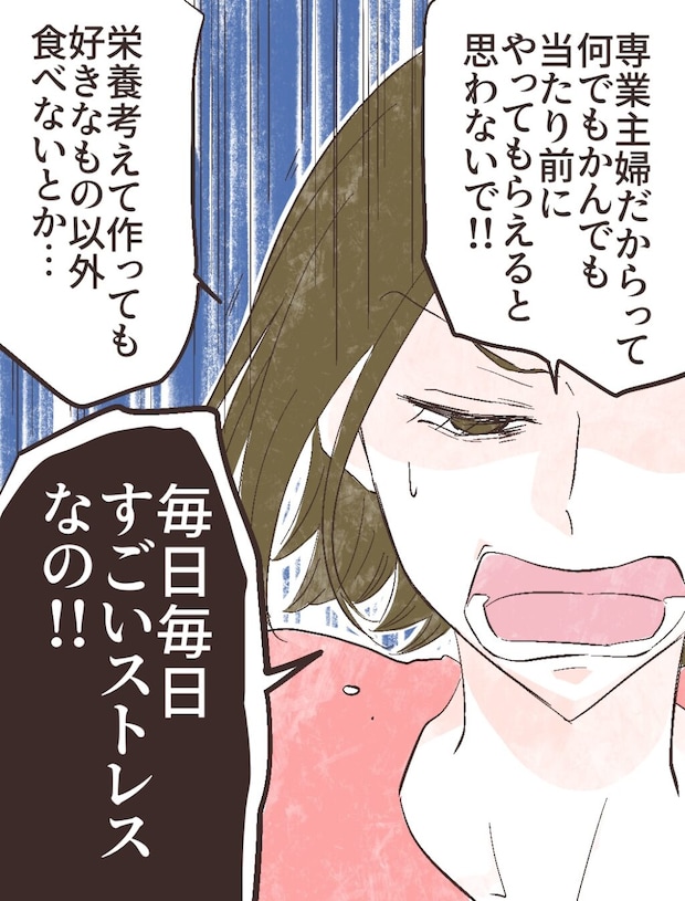 「専業主婦だからって何でもかんでも当たり前にやってもらえると思わないで!!栄養考えて作っても好きなもの以外食べないとか・・毎日毎日すごいストレスなの!!」私はこれまで溜め込んでいたモヤモヤを爆発させました。