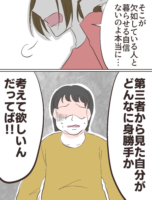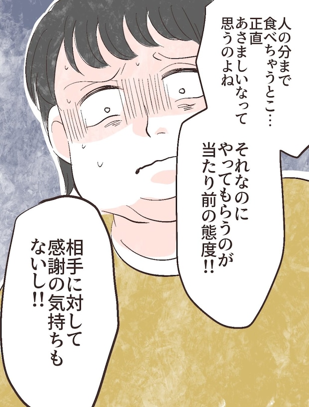 「人の分まで食べちゃうとこ・・正直あさましいなって思うのよね。それなのにやってもらうのが当たり前の態度!!相手に対して感謝の気持ちもないし!!」ずっと我慢してきた私の剣幕に圧倒されるフトシ。
