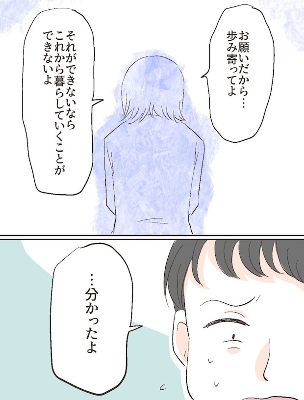 ずっと我慢していた思いをフトシにぶつけた私は「お願いだから・・歩み寄ってよ。それができないならこれから暮らしていくことができないよ」と絞り出すように言いました。自分の身勝手な行動がここまで私を追い詰めていたことにようやく気付いた様子のフトシは「・・分かったよ」と静かに言いました。