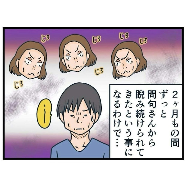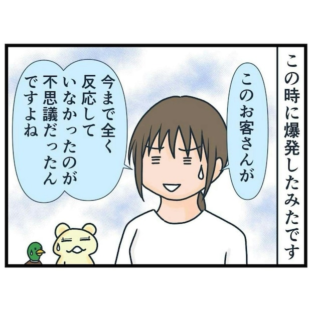 しかし問句さんの態度は次第にエスカレート。相手を睨んだり、じろじろと行動を見続けたりとやりたい放題です。そんな日が続いていた時、ついに新規のお客さんが問句さんに言い返す事態が勃発し…?