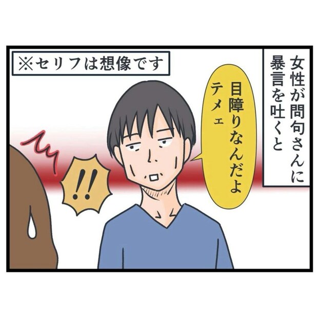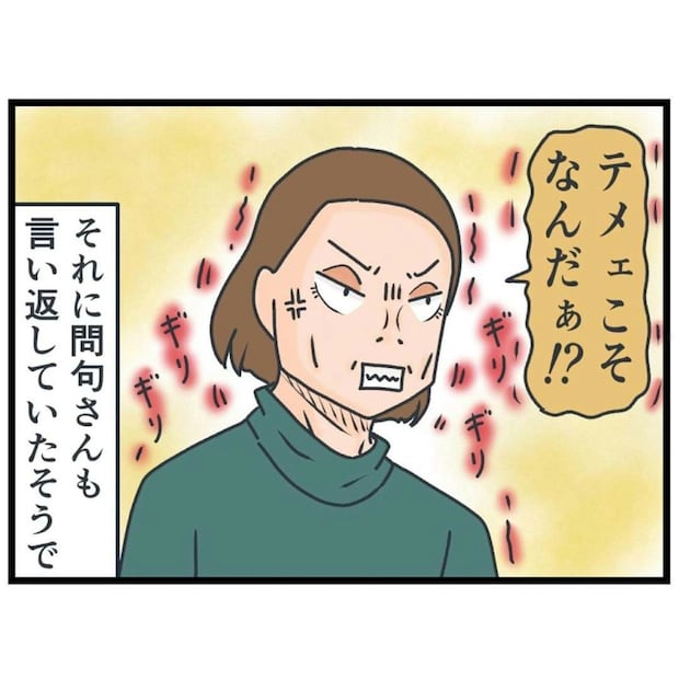 問句さんの態度に耐えかねてついにブチ切れた青い服の女性。これまでは一方的に受けていた嫌がらせに対し、報復するようになってとのこと…。