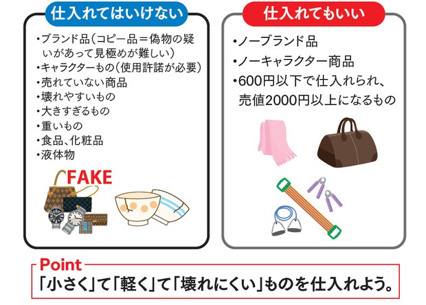 仕入れ金額は目安で、販売価格の1/3以下ならいいのですが、最初はリスクを抑えるためにも単価が低めの商品を扱いましょう。また、ブランド品は偽物が普通に売られていますし、キャラクターものは使用許諾が必要ですので注意しましょう。