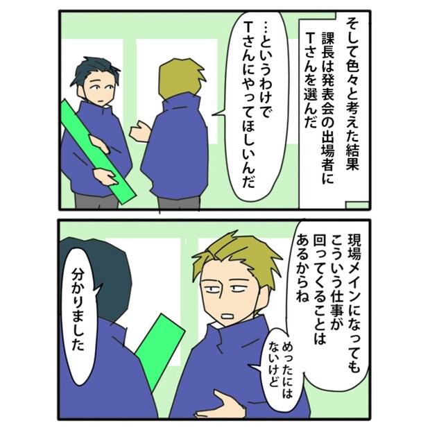 課長は、Tさんのフォローを前提とした推薦理由に賛成ではなかったものの、周りの社員やTさんの状況を改めて考え、最終的に発表会の担当にTさんを指名することにしました。