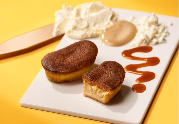 上層には焼きバナナのように香ばしいバナナキャラメル生地を重ねた二層仕立て。じっくり焼き上げることで生まれる、しっとりとした口どけが魅力。約2週間、日持ちする。