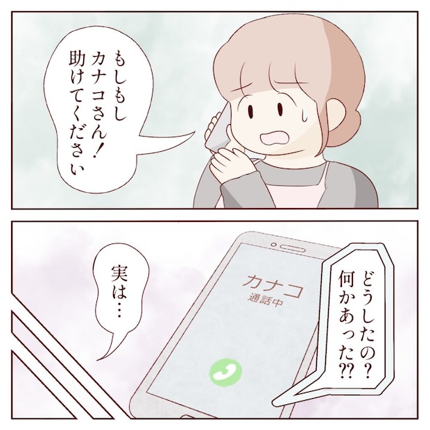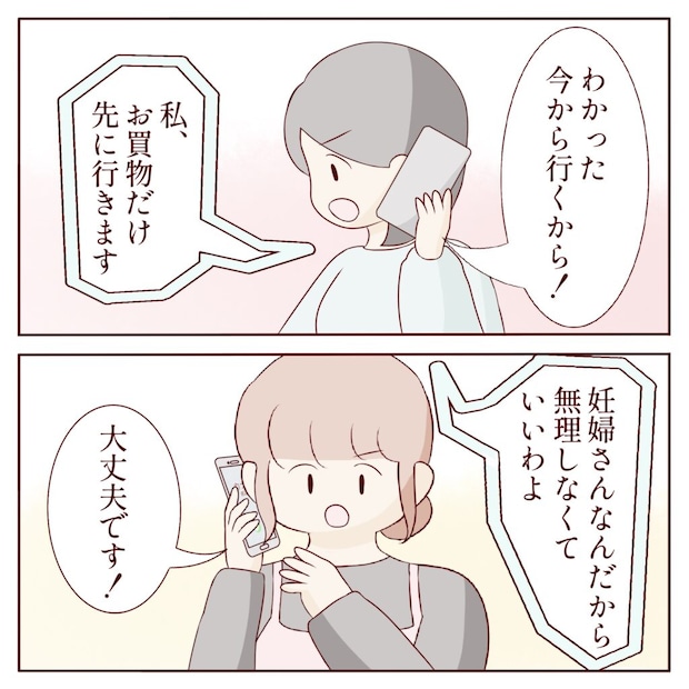 カナコさんに事情を説明すると、すぐに「わかった、今から行くから!」と言ってくれました。その言葉にヒナさんはホッとします。「私、お買い物だけ先に行きますね」と伝えると、カナコさんは「妊婦さんなんだから無理しなくていいわよ」と優しく気遣ってくれました。