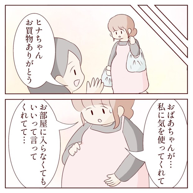 看病に必要なものを買い揃えて義祖母宅に戻ると、すでに到着していたカナコさんが「ヒナちゃん、お買い物ありがとう」と出迎えてくれました。「おばあちゃんが私に気を使ってくれて、お部屋に入らなくてもいいって言ってくれてて・・・」ヒナさんは状況を説明します。