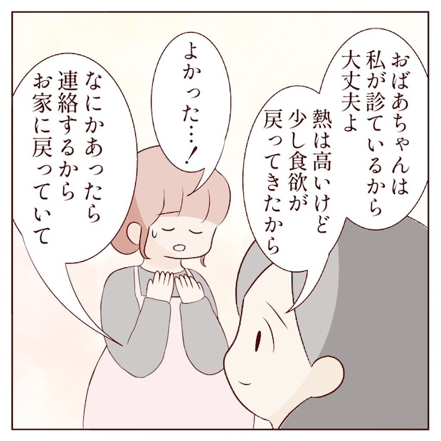 「おばあちゃんは私が診ているから大丈夫よ、熱は高いけど少し食欲が戻ってきたから」カナコさんから義祖母の容体を聞いたヒナさんは「よかった・・・!」と胸を撫でおろします。「なにかあったら連絡するからお家に戻っていて」ヒナさんはその言葉に甘えて、自宅に戻ることにしました。