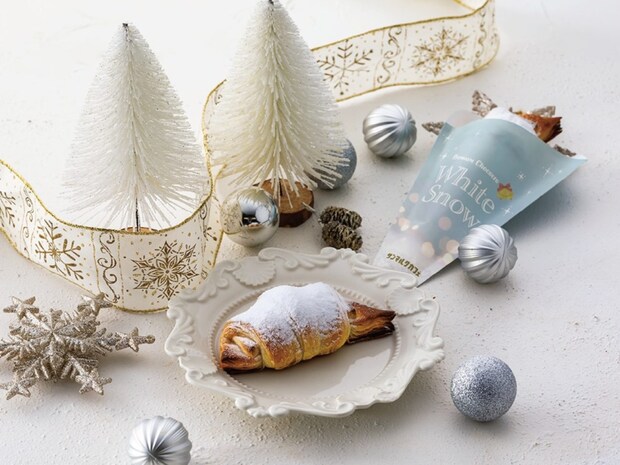 『ホワイトクリスマス』をテーマにした、冬限定のプレミアムチョコクロ。定番商品「チョコクロ」のサクサクとしたクロワッサン生地の中に、ミルキーなホワイトチョコレートを包み、焼き上げた。焼き上がった表面には、粉雪のようなパウダーシュガーを振りかけている。