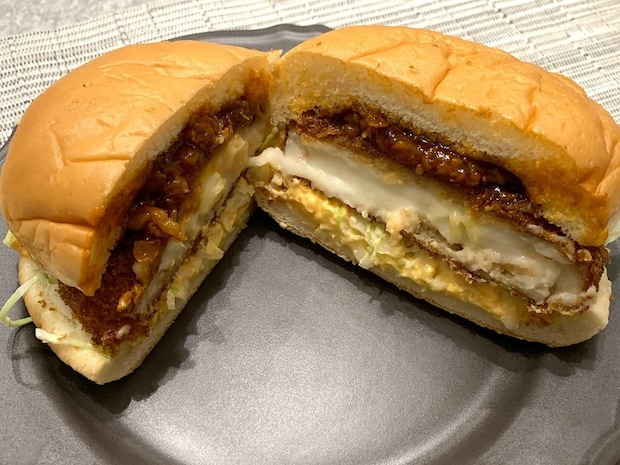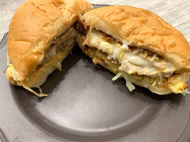 バンズに挟まれているのは、エビとマカロニ入りのグラタンコロッケ、キャベツ、そして特製たまごソースです。手で持ってみるとバンズはしっとりふわふわで、中の具材だけでなくバンズへの期待も膨らみます♪