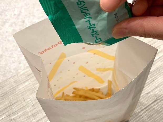 作り方としては、ローストガーリックバター味のシーズニングを注文するとシャカシャカする用の袋が付いてくるので、袋にポテトを入れていきます。