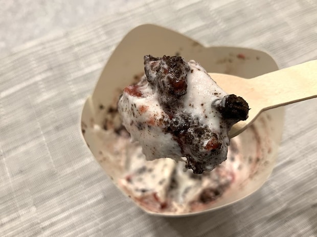 オレオクッキーもたっぷり入っており、ザクザク食感で食べごたえあり!若干のほろ苦さがあるので、甘さを引き締める良い役割を果たしてくれていますよ♪
