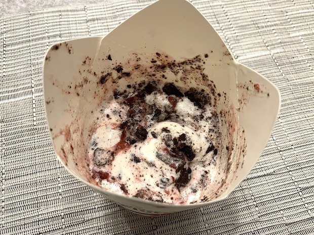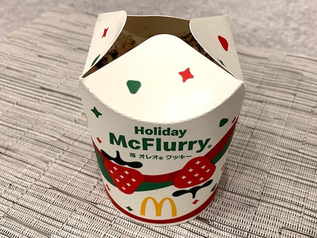 中には、オレオクッキーとストロベリーソースを混ぜ込んだソフトクリームがたっぷり!2022年11月に登場した「マックフルーリー ストロベリーココアクッキー」の再販のようで、人気が高かったのがうかがえます♪