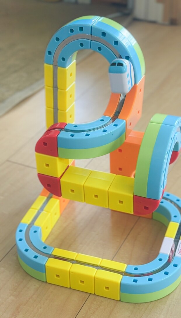 レールを敷くのではなく、キューブを積み上げて三次元のコースを作り、電動のミニトレインを走らせる立体レールおもちゃです。