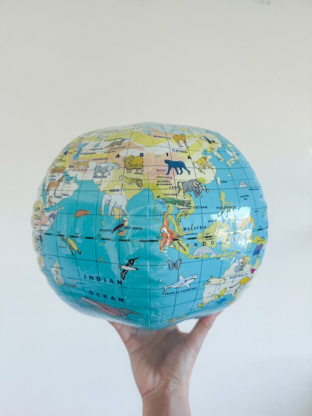 空気を入れてふくらませるタイプの地球儀ボールで、世界の国々にすむ動物たちがたくさん描かれていて、いわば遊べる地球儀。