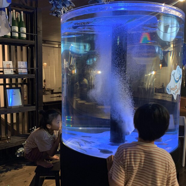 水槽にいたサバの赤ちゃんに夢中だった二人