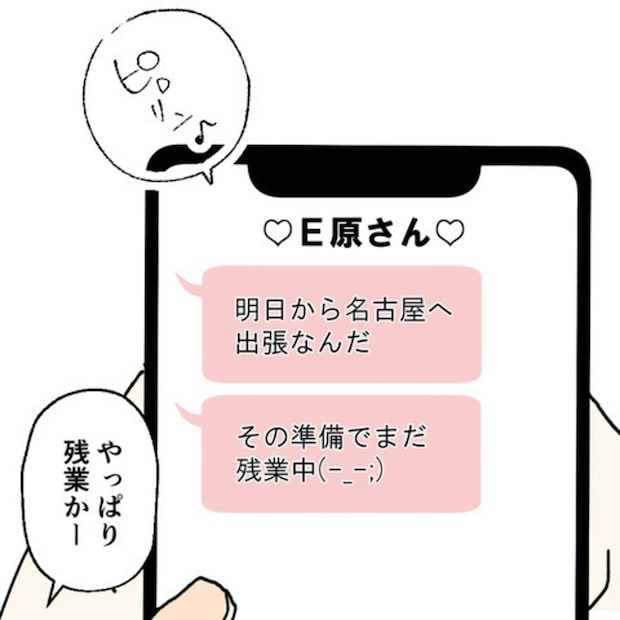 E原さんは明日から名古屋へ出張で準備に追われているようです。S葉さんは話したいことがあったのに、次の休みの日に会おうと思うのでした。