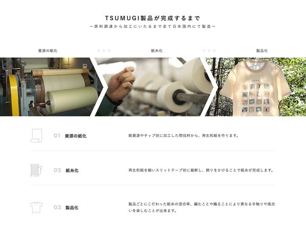 プロジェクト「TSUMUGI」は、使用後の紙資源や未利用の間伐材を紙糸に生まれ変わらせる取り組み。紙糸は、天然繊維ならではの柔らかさと軽量性、吸放湿性が特徴で、まるで自然の中にいるようなやさしい肌触りを感じられるそう。