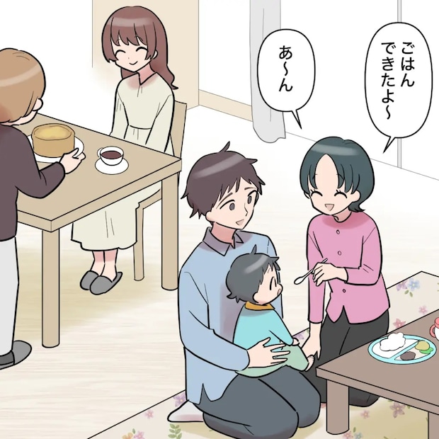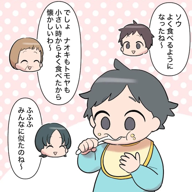もぐもぐとごはんを食べるソウくんを見て「ソウ、よく食べるようになったね~」トモヤがそう言うと、義母は嬉しそうな顔をして「ナオキもトモヤも、小さい時からよく食べたから懐かしいわ~」と話しました。そのやり取りを見ていたキョウカさんも「みんなに似たのね~」と笑顔で言います。