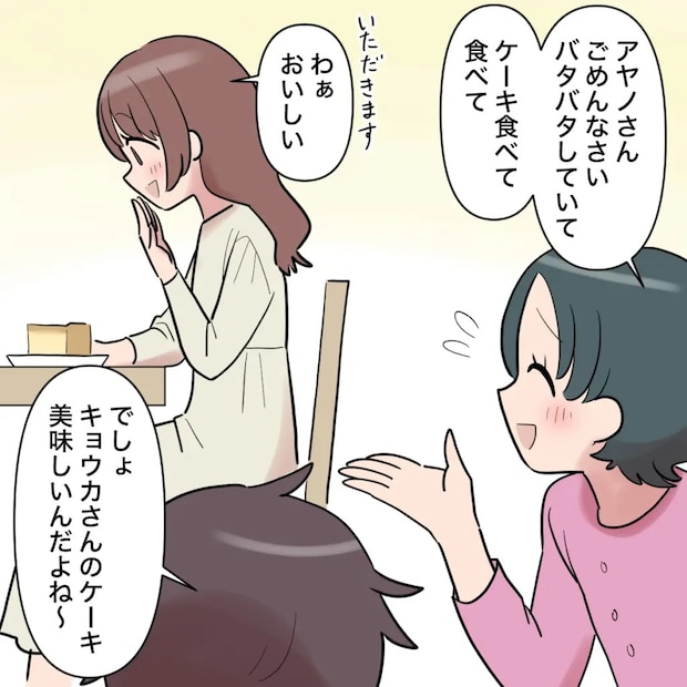 すると「ごめんなさいバタバタしていて、ケーキ食べて食べて」と、キョウカさんが声をかけてくれました。「いただきます・・・わぁおいしい」手作りケーキに感動していると、トモヤがどこか誇らしげに「でしょ、キョウカさんのケーキ美味しいんだよね~」と言いました。