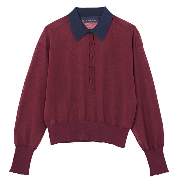 「色気のあるボルドーカラーが気になる! 大人にこそ着てほしい」。ボルドーポロニット¥31,900(マルティニーク/マルティニーク ルミネ横浜)