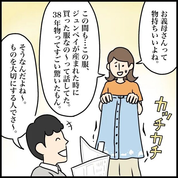 「お義母さんって物持ちいいよね。この間も『この服、ジュンペイが生まれた時に買った服なの~』って話してた。38年物ってすごい驚いたもん」とカッチカチに硬くなったバスタオルを持ちながら言うと、「そうなんだよね~。ものを大切にする人でさ~」とやっぱり笑っているジュンペイ。