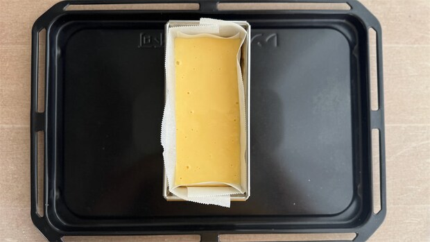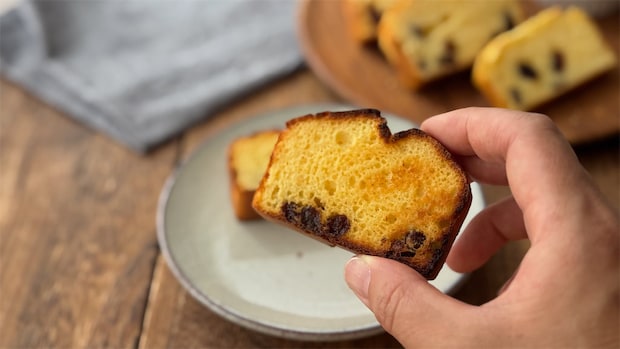 2. [B]を加えて混ぜ、レーズンも合わせる。型に流し入れ、やさしくトントンと型ごと台の上に落として空気を抜く。