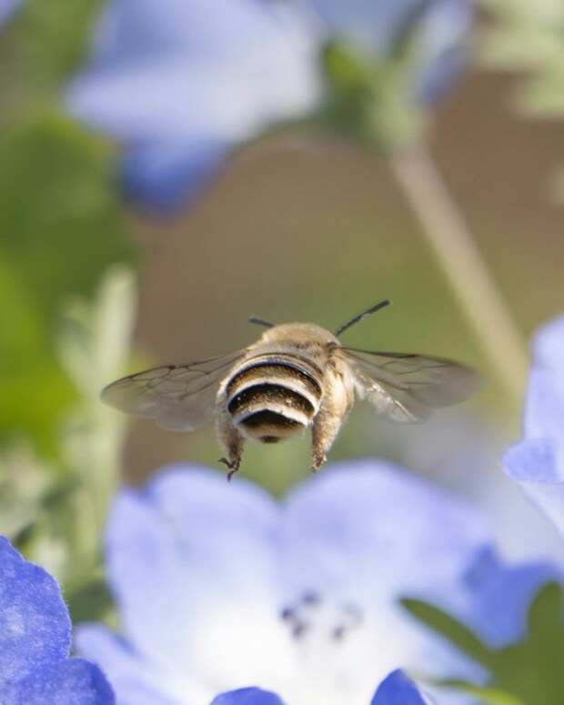 ハチの後ろ姿はこんなにも美しく、かわいいものだったのですね。顔の近くを飛んでいたり、ブーンと羽音が聞こえたりすると思わず恐怖を感じていたのですが、このハチはかわいく見えて不思議。丸くむっちりとしたフォルムと、ちょこんとした足にキュンとしてしまいました!