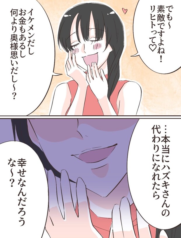 ユウコさんはうっとりした顔でリヒトさんを語り始めました。「素敵ですよね!リヒトって。イケメンだしお金あるし、なにより奥様思いだし~?本当にハズキさんの代わりになれたら幸せなんだろうな~?」