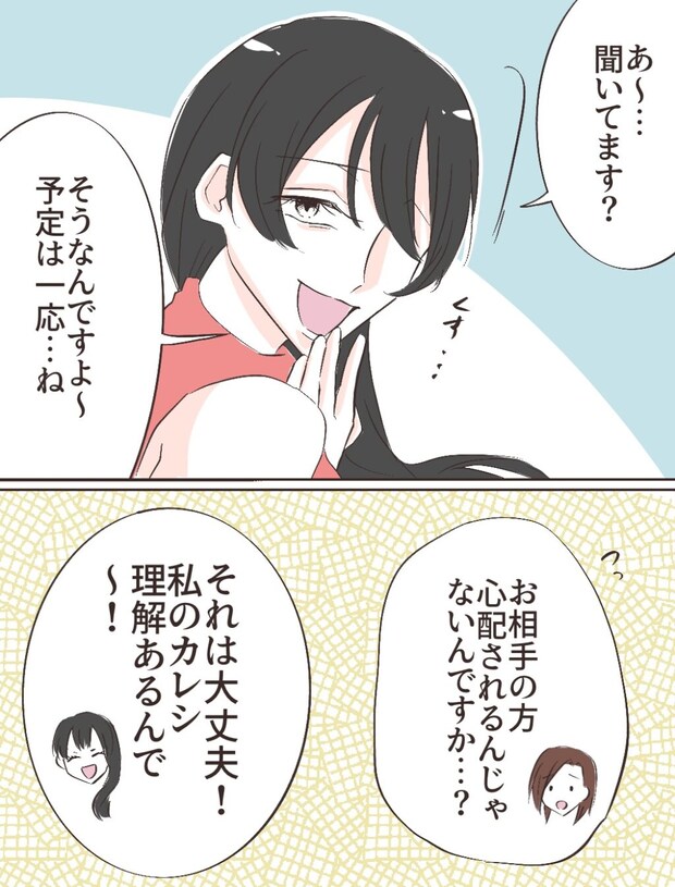 ユウコさんは私の言葉を聞いて「あ~、聞いてます?そうなんですよ~予定は一応・・・ね。」と意味深に笑いました。「お相手の方、心配されるんじゃないんですか?」と聞いても「それは大丈夫!私の彼氏、理解あるんで~!」とユウコさんは笑って言いました。婚約者の女性が、既婚者であろうと他の男性が住む家に住み込みで、しかも健康サポートなんて言いながらいつもべったりくっついているなんて、普通はイヤじゃないのかな。私は不思議で仕方ありませんでした。