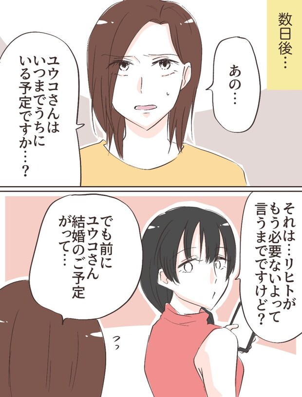 ある日、私は思い切って気になっていることをユウコさんに聞いてみることにしました。「あの・・・ユウコさんはいつまでうちにいる予定ですか?」するとユウコさんは「それは・・・リヒトがもう必要ないよって言うまでですけど?」と、人の夫を呼び捨てにして言いました。「でも前にユウコさん結婚のご予定がって。」