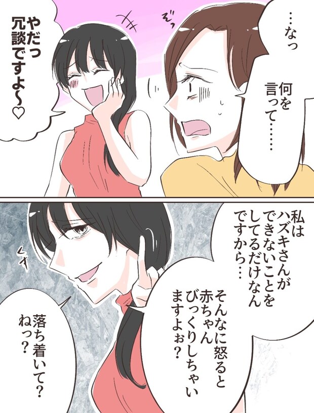 妻の私にそんなことを言うユウコさんにゾッとしました。「やだっ冗談ですよ~」とユウコさんは笑いましたが、全然笑えません。「私はハズキさんができないことをしてるだけなんですから・・・そんなに怒ると赤ちゃんビックリしちゃいますよぉ?落ち着いて?ね?」見下したようにクスッと笑うユウコさん。