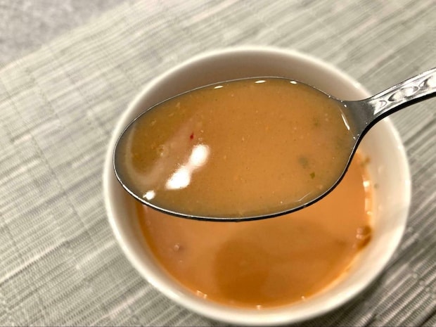 海老粉末が入っているだけあって、魚介感あり!イメージとしては、シーフード味のカップラーメンのスープを飲んでいる感じでしょうか。