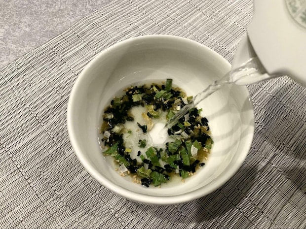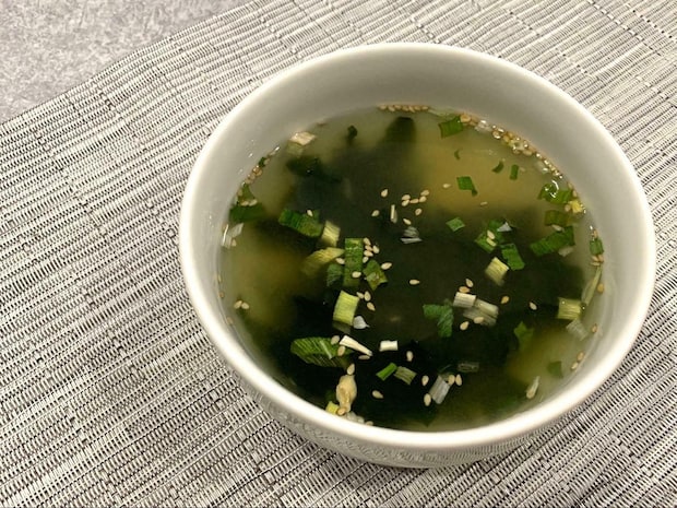 柔らかい食感のわかめに、ネギとゴマを加えて作られたスープ。