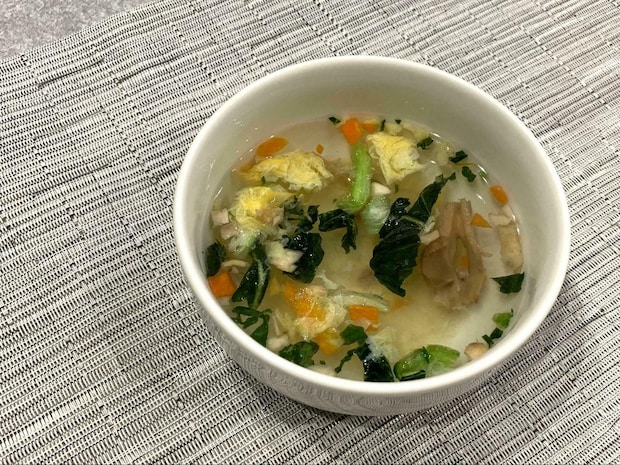 たまご、小松菜、しいたけ、エリンギ、にんじんの5種類の具材を使用したスープ。