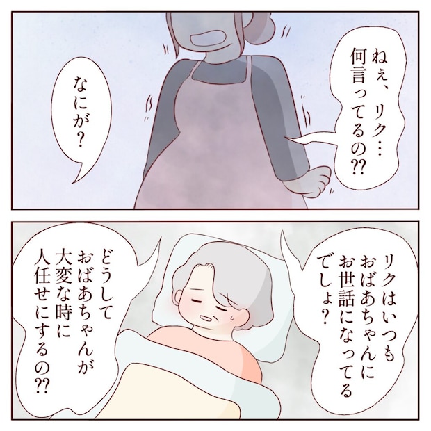 大切な義祖母が大変な目にあっているのに、どこか他人事のようなリクさんを目の当たりにして、ヒナさんは怒りで肩を震わせます。「いつもおばあちゃんにお世話になってるでしょ?どうして大変な時に人任せにするの?」ヒナさんは声を震わせながら問いかけました。