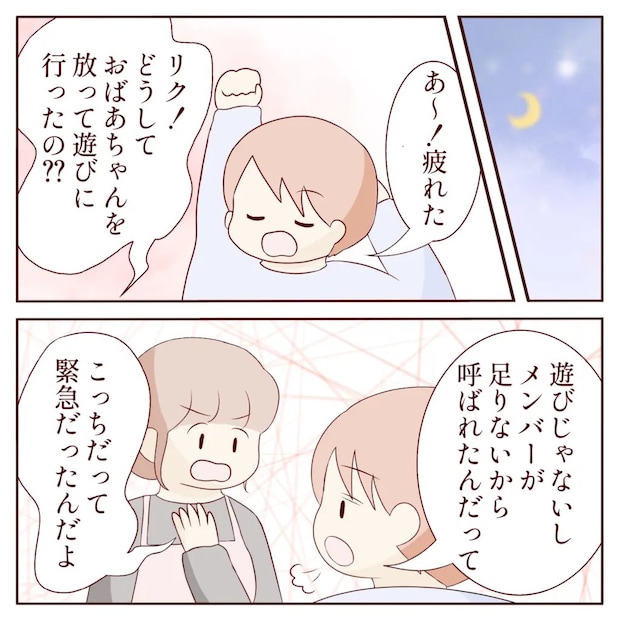 リクさんが帰宅したのは日が暮れてからでした。ヒナさんが「どうしておばあちゃんを放って遊びに行ったの?」と尋ねると、リクさんは「遊びじゃないし、メンバーが足りないから呼ばれたんだって」と悪びれる様子なく答えました。