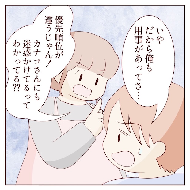 「いや、だから俺も用事があってさ・・・」この期に及んでまだ言い訳をするリクさんに、ヒナさんは「優先順位が違うじゃん!カナコさんにも迷惑かけてるってわかってる?」とはっきりと言い放ちました。