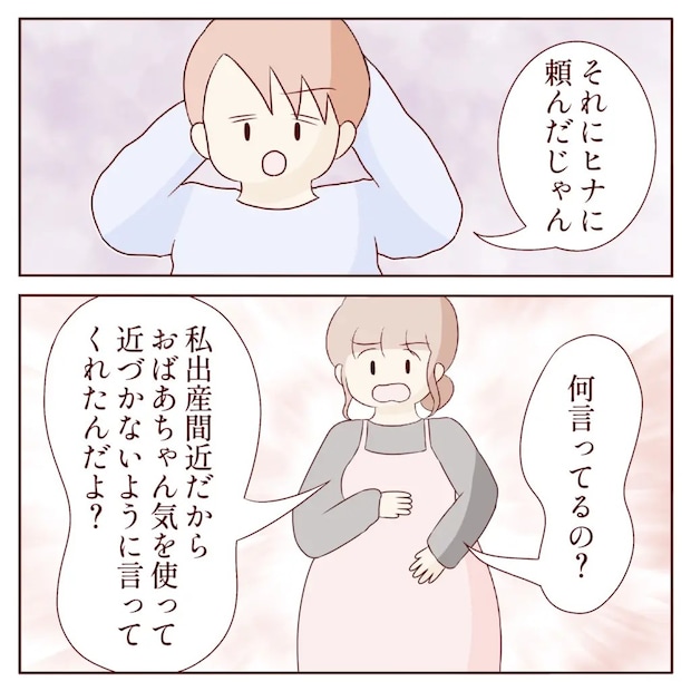 しまいには「それにヒナに頼んだじゃん」と、自分の責任は果たしたとでも言いたげな態度をとります。その言葉にヒナさんは呆れながら「何言ってるの?出産間近だから、おばあちゃん私に気を使って近づかないように言ってくれたんだよ?」と言いました。