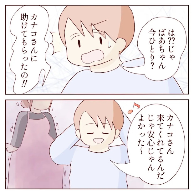 2人目を妊娠中のヒナさんは、夫のリクさんと息子のアオくんと暮らしながら、義祖母と敷地内同居をしています。リクさんは小さい頃に母親を亡くしており、ずっと義祖母が母親代わり。義祖母の溺愛っぷりは凄まじく、甘やかされて育ったリクさんは結婚して子どもが産まれても、身の回りのお世話を義祖母にしてもらっています。一方の義祖母は、毎日喜んでリクさんのお世話をしますが、嫁なのにリクさんの世話をしないヒナさんに呆れている様子。ある日、家事育児のことでヒナさんと口論になったリクさんは、義祖母の家に行ってしまいます。2週間が経った頃、リクさんから「義祖母が熱を出した」とメッセージが。しかし驚くべきことに、リクさんは義祖母を放置して出かけてしまったと言うのです。急いで義祖母宅に駆けつけたヒナさん。しかし「妊婦だから入ってはダメ」と看病させてくれません。すがるような思いでカナコさんに電話すると、すぐに駆けつけてくれることに。その後カナコさんの協力もあり、義祖母の容体は安定。ヒナさんはホッと胸を撫でおろしました。