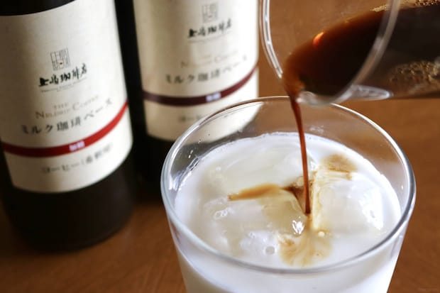 ミルク珈琲ベース40ml+ 牛乳160ml+ 黒糖蜜 30mlで上島珈琲店の「黒糖ミルク珈琲」の味を再現できる商品。