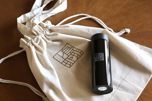 非売品の「オリジナルロゴ入り真空ステンレスボトル230ml」と「オリジナルロゴ入り巾着トート」はシンプルなデザインでとてもおしゃれ。