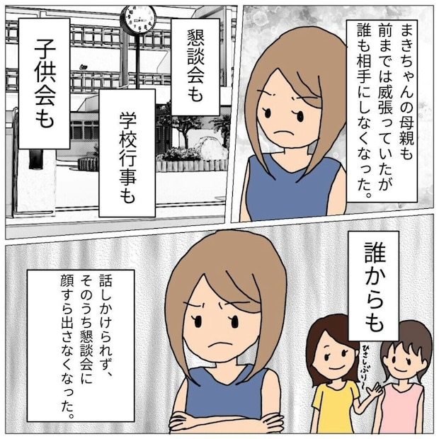 謝罪どころか、クラスで孤立し始めたまきちゃんを見たまきちゃんのママは、「内容証明を送る」と被害者のようにフォロワーさん宅へと押しかけてきたのです。そしてまきちゃんのママも孤立していったのでした。