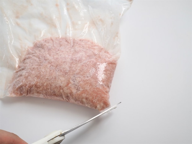 2. 肉だねをビニール袋の下に寄せ、ハサミで端を小さく切る。