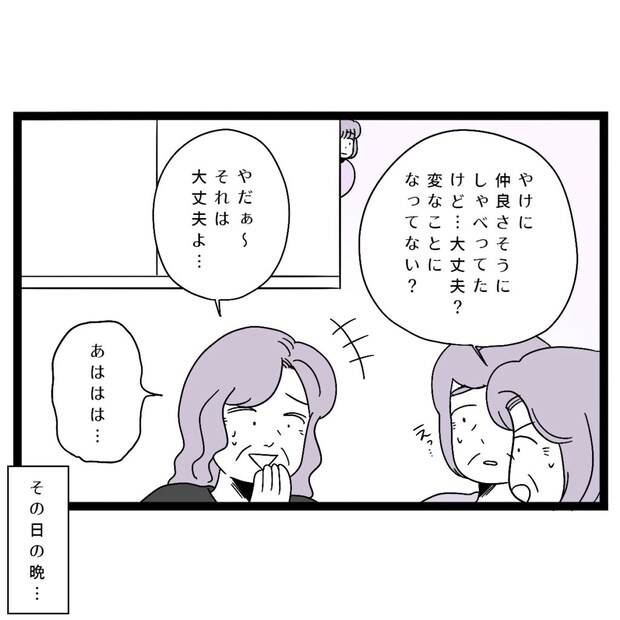 「やけに仲良さそうにしゃべってたけど・・大丈夫?変なことになってない?」と言われ、「やだぁ~。それは大丈夫よ・・。あははは・・」としどろもどろになりながら答えていました。